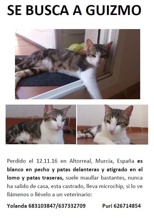 21 noviembre, 201621 noviembre, 2016Guizmo desaparecido!In Últimas noticias de EL COBIJOTags buscar, gatos, perdido Guizmo se ha perdido de su casa de acogida, ayudanos a encontrarlo compartiendo sobre todo con amigos y conocidos que sepas que viven en la zona en la que se ha perdido, en Altorreal-Murcia, esperamos encontrarlo muy pronto.